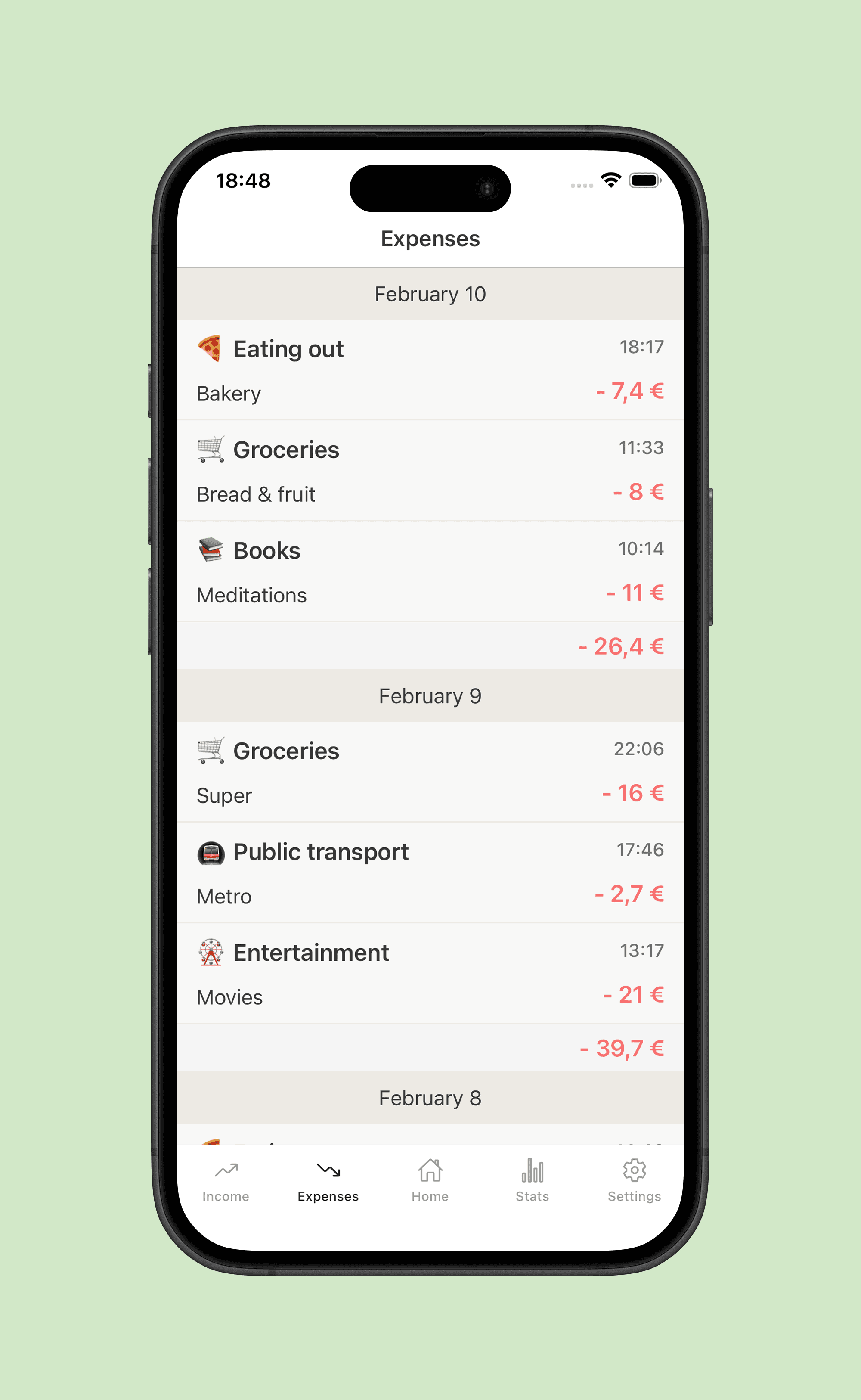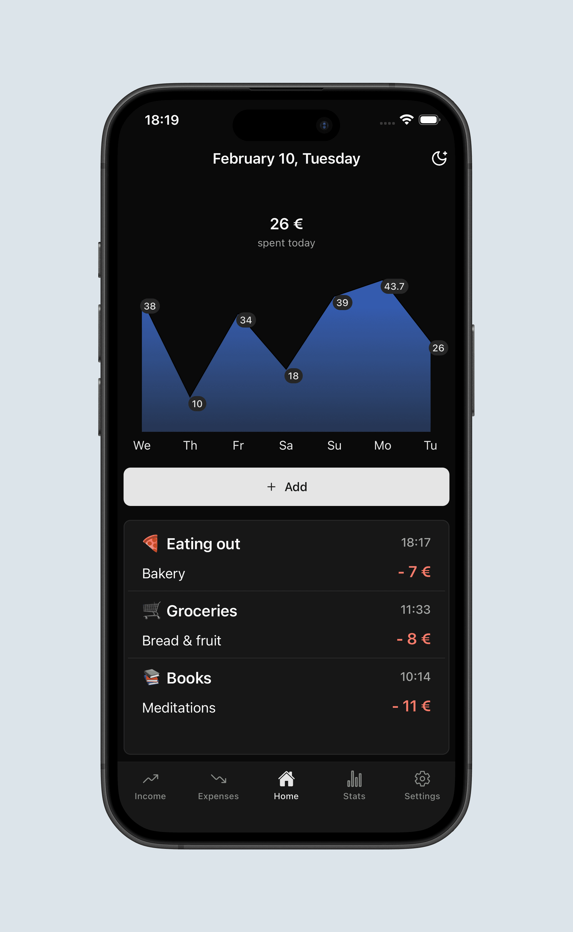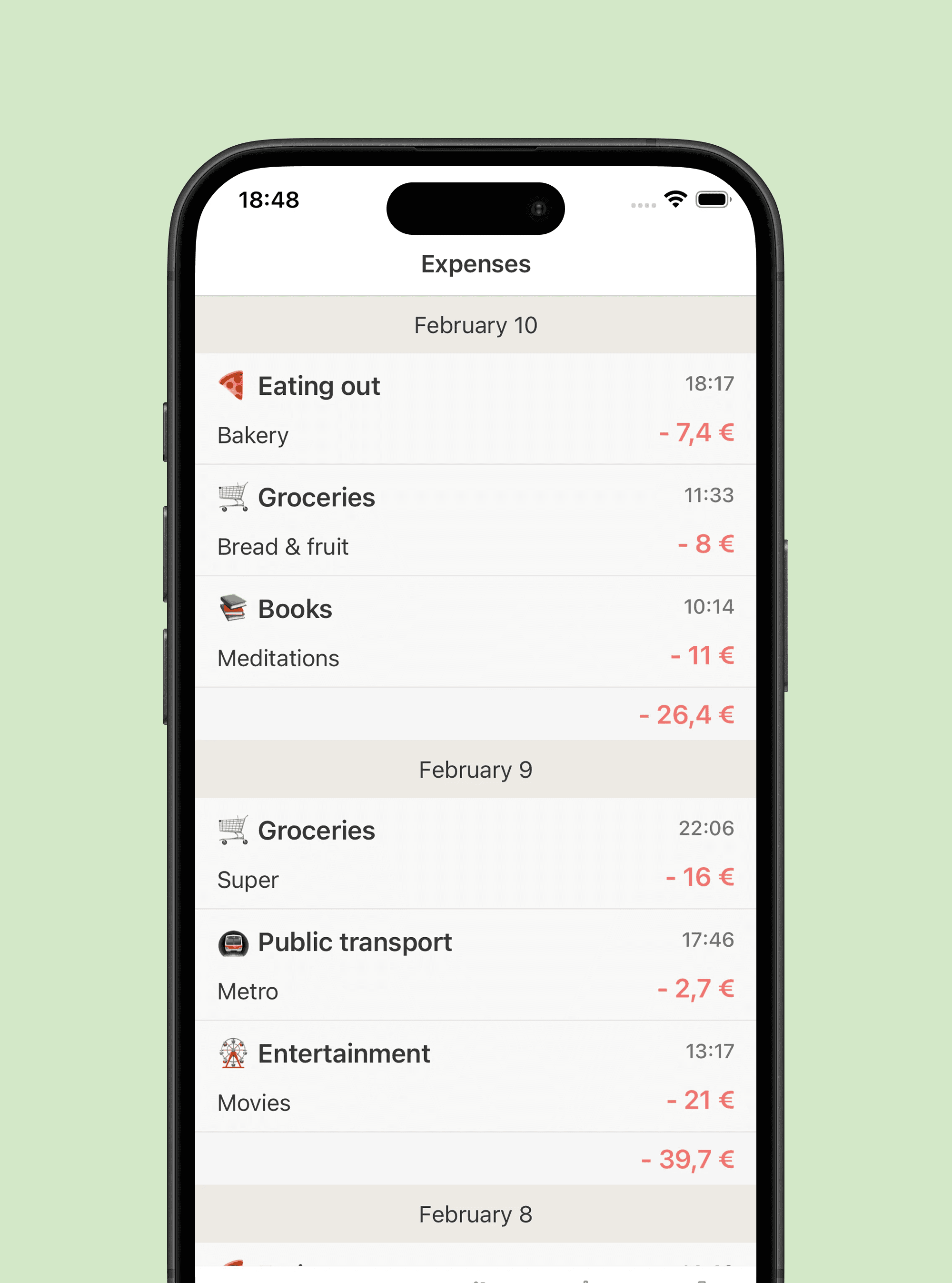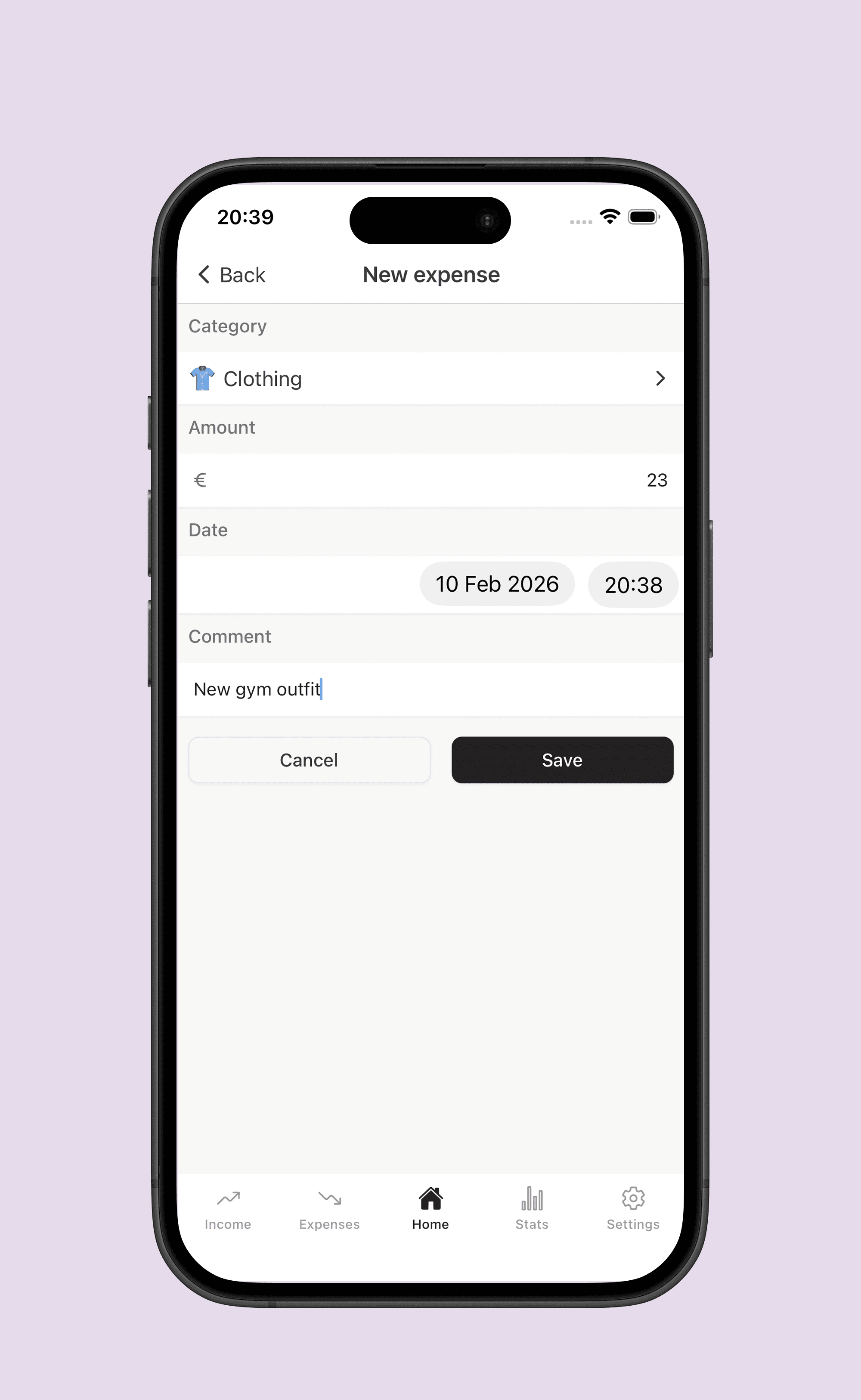 Simply enter amount + category. Add a note if you want